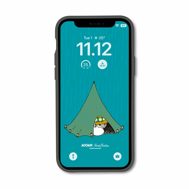 Durable Moomin phone case made of 100% compostable materials. The phone case is very pleasant in the hand and at the same time ensures a good grip on your phone. Phone case has been developed to be user-friendly which means that there is easy access to the phones connections and the phone's keyboard. The cover also supports the use of wireless charging stations. Responsible choices also affect the packaging of the product, we do not use any plastic at all, and also, the printing ink is environmentally friendly and we have chosen 100% recycled cardboard as the material. Therefore, the entire package with its contents is recyclable.