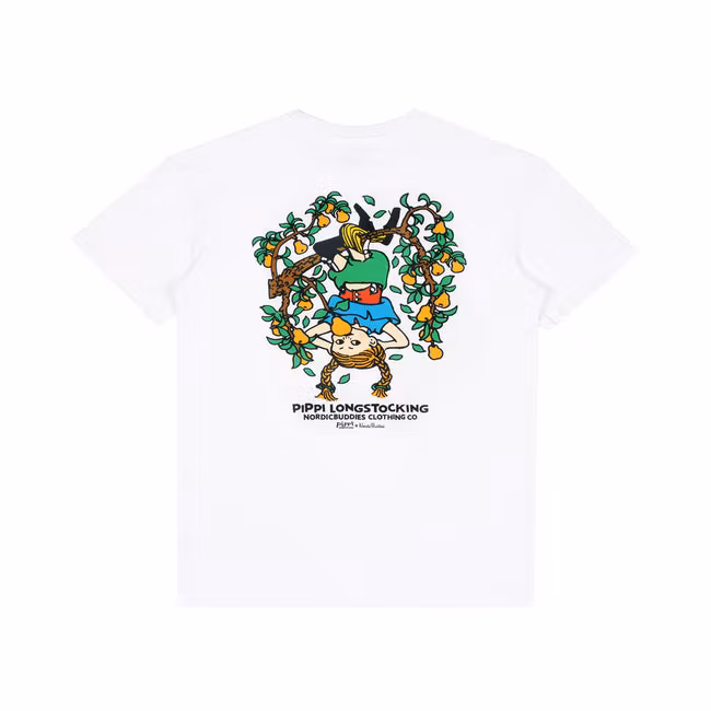 The NordicBuddies Pippi in the Tree T-Shirt features a playful illustration of Pippi Longstocking confidently perched in a tree, capturing her adventurous spirit. Made from soft, high-quality cotton, it offers comfort for everyday wear. The crisp white fabric highlights the colorful print and gives the shirt a clean, versatile look. Its classic fit pairs easily with any casual outfit. Perfect for fans of Nordic charm, this tee brings a nostalgic and joyful touch to your wardrobe.
