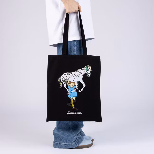 The NordicBuddies Pippi Tote Bag features a bold illustration of Pippi Longstocking that stands out sharply against the sleek black fabric. Made from durable, high-quality material, it’s designed to handle everyday use with ease. The spacious interior provides plenty of room for books, groceries, or daily essentials. Comfortable shoulder straps make it practical for both errands and outings. Perfect for fans of Pippi’s adventurous spirit, this tote adds a playful Nordic touch to any day.