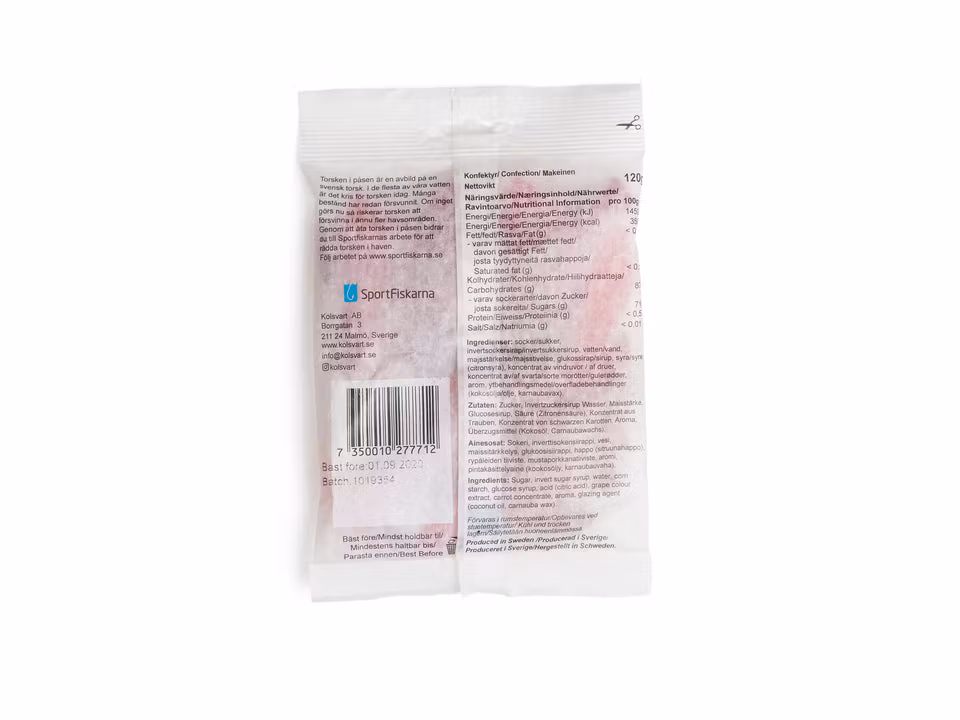 Fisch mit den Geschmacksrichtungen Schwarze Johannisbeere und Himbeere in einer gemischten Tüte. Ein Teil des Erlöses aus diesem Produkt wird an Sportfishers und ihre Arbeit zur Verbesserung der Wasserumwelt in Schweden gespendet. Die gute Tat steigert den Geschmack!Zucker, Invertzuckersirup, Wasser, Maisstärke, Glukosesirup, Säure (Zitronensäure), Traubenkonzentrat, schwarzes Karottenkonzentrat, Aroma, Oberflächenbehandlungsmittel (Kokosnussöl, Carnaubawachs).