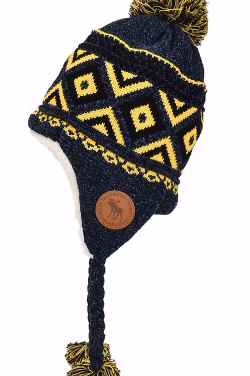 Die Robin Ruth Bon Bon Lederstempel-Wintermütze in Schwarz und Gelb vereint minimalistisches Design mit kuscheligem Komfort. Sie ist aus Acrylstrick gefertigt und zeigt anstelle von Text ein Motiv im Lederstempel-Stil für einen eleganten, dezenten Look. Die schwarze Basis wird durch gelbe Details akzentuiert, darunter ein Bommel oben und geflochtene Quasten an den Ohrenklappen für einen verspielten Charakter und Wärme. Innen isoliert ein weiches Futter vor Kälte. Diese Wintermütze in Einheitsgröße bietet flexiblen und bequemen Tragekomfort – ideal als stilvolles saisonales Accessoire oder Geschenk.