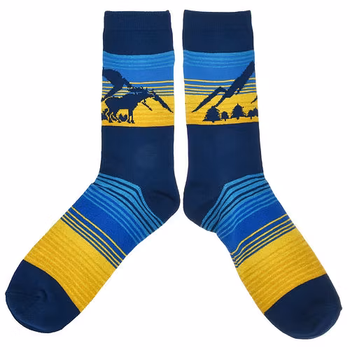 Diese klassischen Socken von Robin Ruth zeigen eine lebendige, mehrfarbige Landschaft, inspiriert von den schwedischen Bergen, mit malerischen Gipfeln und nordischen Motiven in satten, erdigen Tönen. Die Größe ist in den EU-Größen 40–45 erhältlich. Hergestellt aus einem weichen und strapazierfähigen Baumwoll-, Polyester- und Elastan-Mix, bieten sie atmungsaktiven Tragekomfort mit leichter Dehnbarkeit für ganztägigen Tragekomfort. Das Crew-Länge-Design reicht bis knapp über den Knöchel und macht sie ideal zu Freizeitschuhen oder Stiefeln. Diese Socken sind strapazierfähig und maschinenwaschbar und eignen sich sowohl für den Alltag als auch als stilvolles skandinavisches Andenken. Ihre malerischen Bergmotive und die kräftigen Farben verleihen jedem Outfit eine gemütliche nordische Wildnis-Atmosphäre.