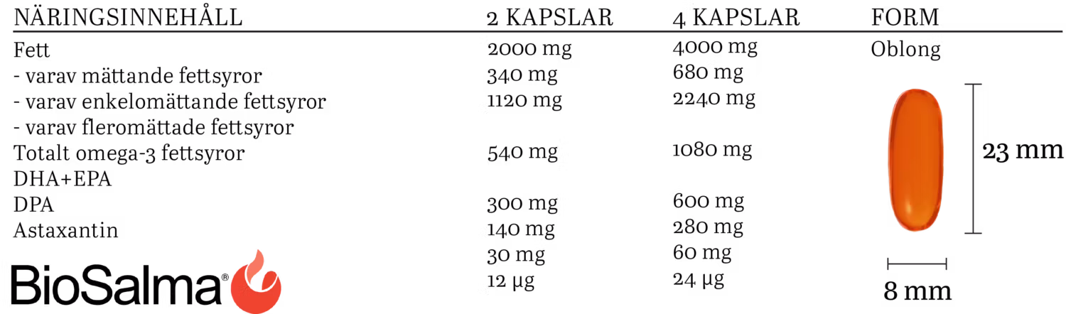 CONTENIDO NUTRICIONALPOR DOSIS DIARIA 2 CÁPSULASPOR DOSIS DIARIA 4 CÁPSULASGrasas2000 mg4000 mg- de las cuales ácidos grasos poliinsaturados540 mg1080 mg- de las cuales ácidos grasos monoinsaturados- de las cuales grasas saturadas1120 mg340 mg2240 mg680 mgÁcidos grasos omega-3 totales300 mg600 mgDHA + EPA*140 mg280 mgDPA**30 mg60 mgAstaxantina12 µg24 µg*Ácido docosahexaenoico, ácido eicosapentaenoico**Ácido docosapentaenoico