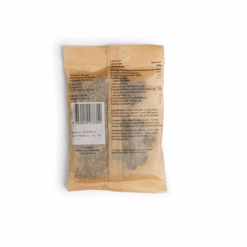 Sirope, harina de trigo, azúcar, agua, sirope de azúcar invertido, harina de centeno, regaliz, sal, aroma, agente de tratamiento de superficie (aceite de coco, cera de carnauba).