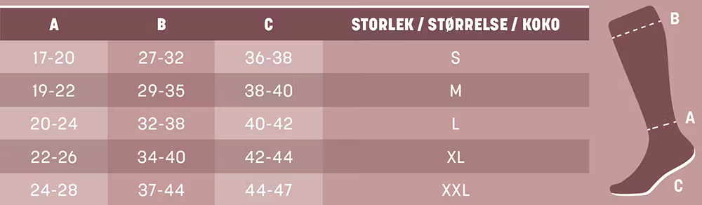 Talla XXL: Contorno de tobillo: 24-28 cm (A), Contorno de pantorrilla: 34-40 cm (B), Talla de calzado: 43-44 (C), Largo de calcetín: 33 cm qué: 37-44 cm (B), Talla de calzado: 44-47 (C), Largo de calcetín: 35 cm