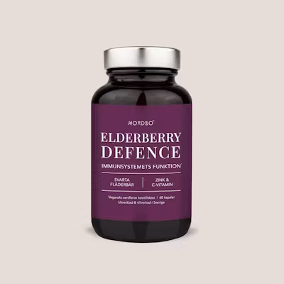 Elderberry Defense contiene extracto de baya de saúco (Sambucus Nigra), vitamina C neutra en ácido y picolinato de zinc. *Las bayas de saúco, la vitamina C y el zinc contribuyen a mantener el funcionamiento normal del sistema inmunitario. La vitamina C y el zinc ayudan a proteger las células contra el estrés oxidativo. Elderberry Defense se puede tomar durante todo el año o antes de la temporada. Certificado vegano por Djurens Rätt y fabricado en Suecia.