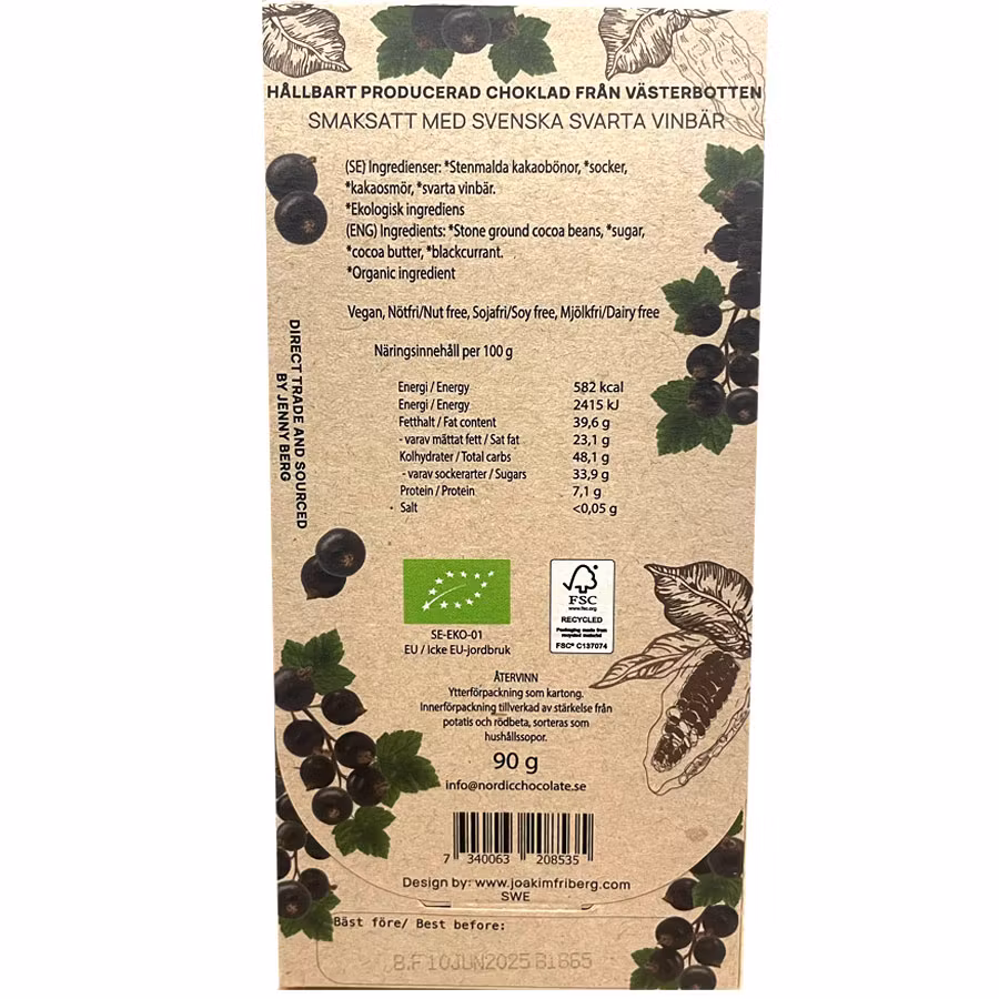 Las grosellas negras del norte de Suecia tienen un sabor afrutado elegante y dulce y una acidez excitante que le da al chocolate negro una nueva dimensión. Las bayas crecen en arbustos y son ingredientes populares en tartas y jugos en los hogares suecos. Nuestras grosellas negras se secan crudas sin azúcar añadido para preservar su alto contenido nutricional y sabor.