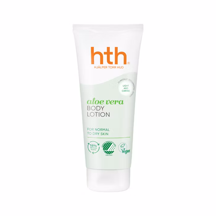 La loción corporal con aloe vera de HTH contiene los ingredientes hidratantes urea y ácido láctico que se encuentran de forma natural en la piel. También contiene aloe vera, que tiene un efecto calmante. La crema para la piel tiene un aroma fresco y está ligeramente perfumada. Viene en un envase de 200 ml.