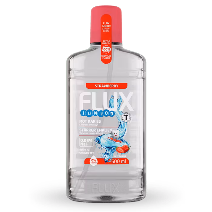 El producto no contiene alcohol. Las versiones de frambuesa y fresa tampoco contienen colorantes. El envase cuenta con un práctico dosificador que facilita a los niños obtener la dosis correcta en cada uso. Flux Junior lleva el símbolo de recomendación de la Asociación Dental Sueca y se desarrolla en Suecia en estrecha colaboración con profesionales de la salud dental.