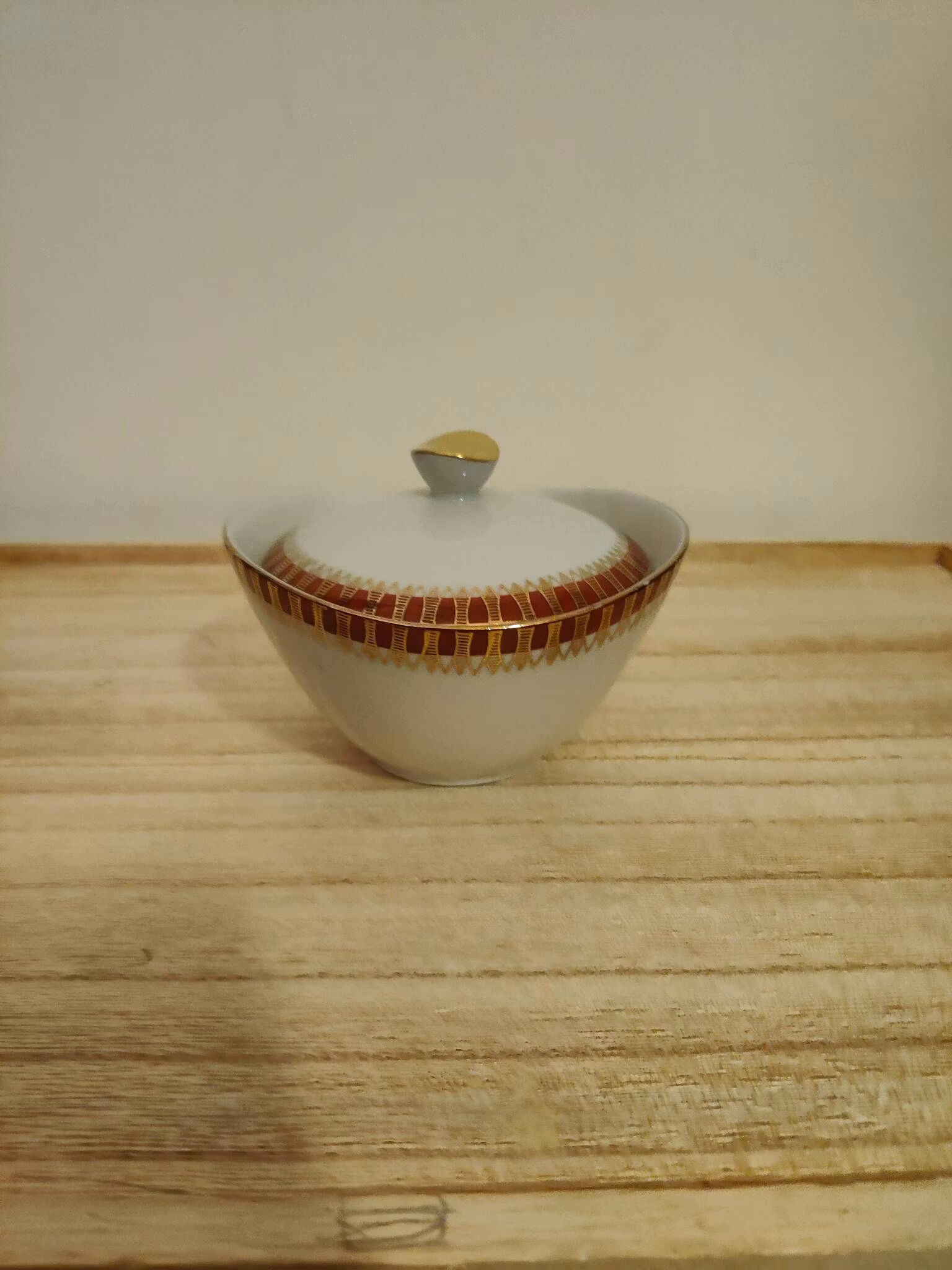 El azucarero y la tapa tienen una banda de color burdeos y dorado. Considerando las líneas simples y elegantes de este, me aventuro a decir que fue creado más cerca de la década de 1960 para hacerlo más moderno de mediados de siglo.
