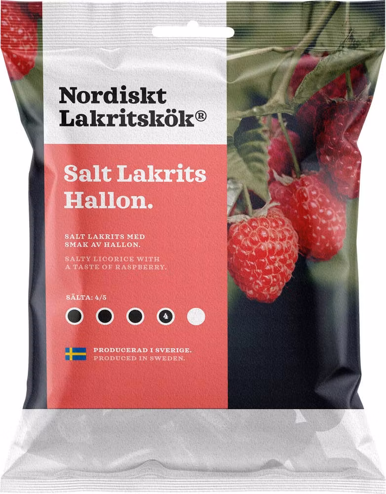 Nordic Licorice Kitchen Salt Liquorice Raspberry is a soft and juicy salt liquorice stump flavored with raspberries that is then rolled in ammonia salt. The ammonia salt nicely breaks up the fruity raspberry flavor. A Swedish-made quality liquorice that draws inspiration from the Nordic region and its licorice-loving population.