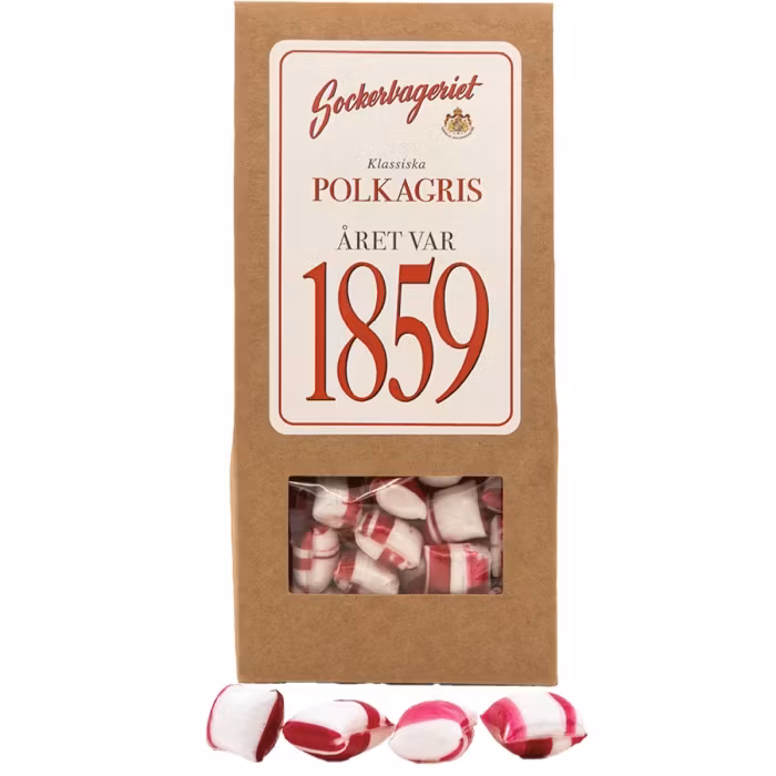 El caramelo clásico Polkagris de Sockerbageriet es un caramelo rojo y blanco con un refrescante sabor a menta. Este apreciado dulce sueco tiene sus orígenes en 1859 y desde entonces ha sido el favorito de adultos y niños.