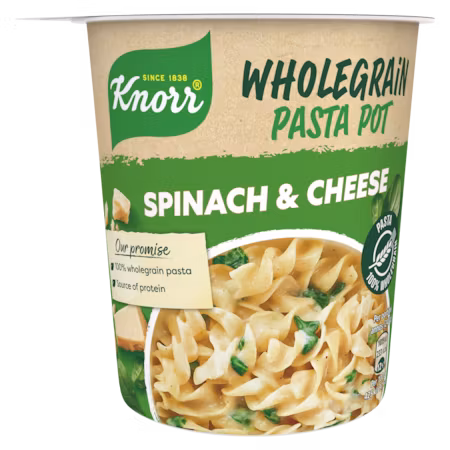 Knorr Snack Pot Spinach & Cheese is a tasty and filling pasta dish that is perfect as a snack or lunch. New Snack Pot contains 100% whole grain pasta and therefore has both fiber and good taste in the same package. Snack Pot is easy to prepare: pour boiling water into the cup, stir and close the lid. The food is ready in five minutes. Snack Pot Spinach & Cheese contains whole grain pasta, cheese and spinach in a good sauce. Snack Pot Spinach & Cheese is suitable for vegetarians. Try other Knorr Snackpot flavors too!
