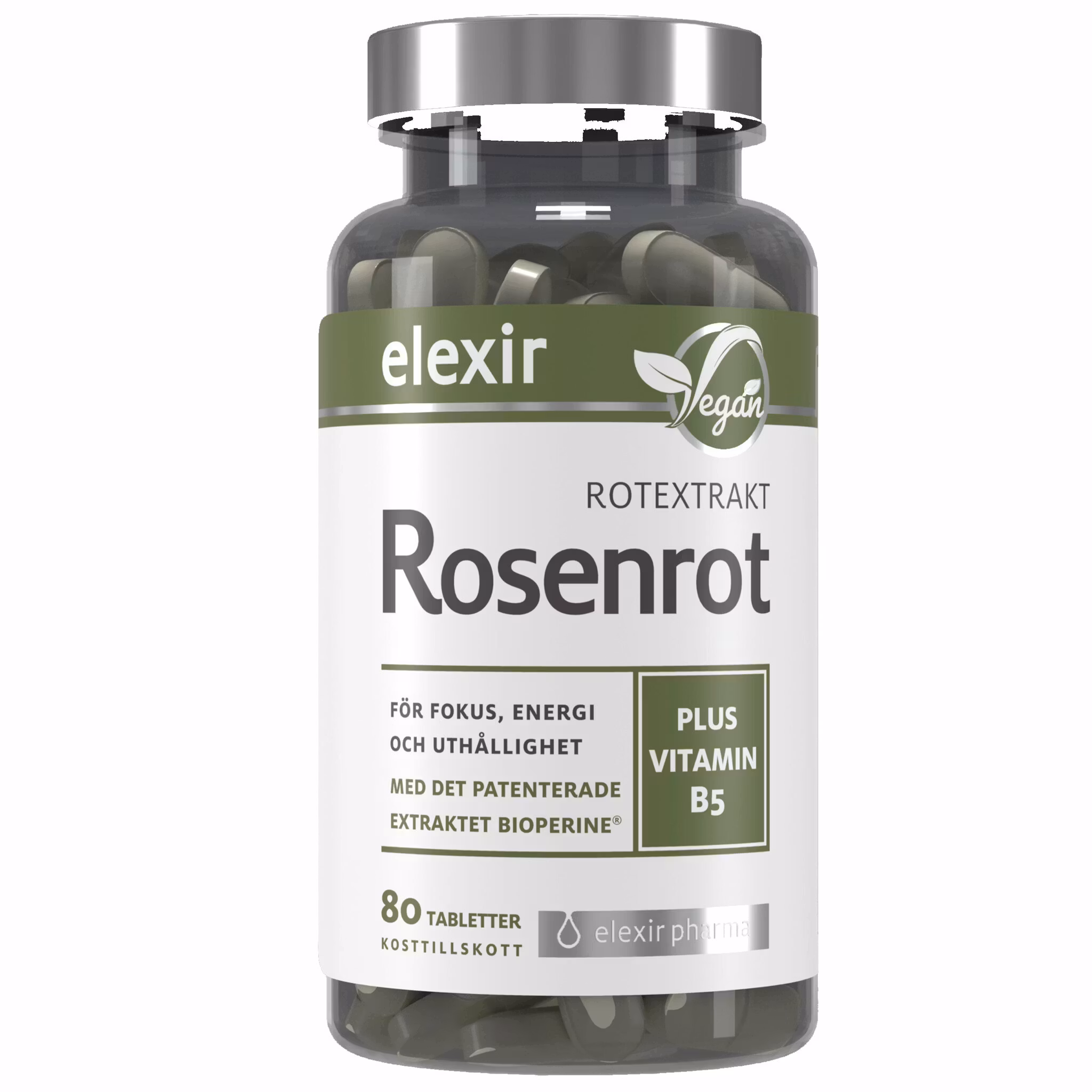 Racine de roseL'une des plantes adaptogènes les plus documentées avec plusieurs propriétés fantastiques qui en font un ingrédient très apprécié dans les compléments alimentaires depuis de nombreuses années. La racine de rose est une plante qui doit son nom au fait que la racine de la plante a un délicieux parfum de rose. La racine de rose prospère mieux dans les climats plus froids et pousse donc, entre autres, dans nos montagnes suédoises. La racine de rose est considérée comme ayant des propriétés qui soutiennent le corps à la fois mentalement et physiquement en relation avec le stress, ce qui peut contribuer à augmenter l'énergie et le bien-être. La racine de rose agit rapidement dans le corps et la plupart des gens ressentent l'effet dans les 30 à 45 minutes. La racine de rose contient plusieurs substances actives, deux des plus connues étant la rosavine et la salidroside. Elexir Rosenrot contient un extrait standardisé hautement concentré avec 1% de vin de rose et 1% de salidroside. Caractéristiques La racine de rose étant un adaptogène, elle possède plusieurs propriétés étonnantes qui sont découvertes grâce à une utilisation à long terme mais surtout grâce à la recherche. La racine de rose est parfaite pour ceux qui font beaucoup d'exercice car elle contribue à augmenter la force et la forme physique, mais aussi pour ceux qui ont besoin de concentration et de vivacité mentale. La racine de rose contribue également à une circulation sanguine normale, ce qui aide le corps à alimenter les cellules en oxygène et en nutriments. La racine de rose aide le corps à faire face à la fatigue et au stress (tant physique que mental), ce qui peut faciliter de nombreux aspects différents de notre vie quotidienne. Le stress au quotidien Le stress est fondamentalement quelque chose de positif car c'est la façon dont le corps mobilise l'énergie et la force avant un test où nous devons faire un petit effort supplémentaire. Mais... si nous ne sommes pas autorisés à nous reposer entre les tours, mais que nous sommes plus ou moins en permanence dans une situation stressante, le « corps et les bourgeons » s'épuisent. L'expérience du stress est très individuelle. Pour certains, il peut s'agir d'un projet au travail qui doit être terminé à une certaine date, pour d'autres, il peut s'agir d'une situation de conflit possible avec leur partenaire ou leur responsable. Il peut même s'agir d'événements quotidiens et récurrents tels que le fait de prendre et de déposer les enfants à la garderie. Le stress peut nous faire manquer d'énergie, ce que beaucoup de gens « soignent » avec de la caféine sous forme de café ou de boissons énergisantes. Une alternative à la caféine qui fournit une énergie plus douce et naturelle qui équilibre le corps est précisément l'adaptogène Rosenroot. Qu'est-ce qu'un adaptogène ? Les adaptogènes sont un nom collectif pour les plantes et les champignons contenant certaines substances bioactives qui affectent la capacité du corps à s'adapter au stress physique, chimique et biologique. Le nom adaptogène vient de l'anglais « to adapt », c'est-à-dire s'adapter. Les adaptogènes normalisent et optimisent les fonctions du corps pour créer un équilibre, ils ne stimulent pas une fonction à sa limite supérieure. Ils n’agissent donc pas de la même manière que les stimulants centraux, comme la caféine par exemple, qui deviennent moins efficaces au fur et à mesure que vous les utilisez et qui stimulent même lorsque vous êtes en équilibre. Les adaptogènes ont le même effet en continu sans que vous ayez à augmenter successivement la dose pour obtenir le même effet qu’au début. Ils ne créent pas non plus de dépendance. Parmi les adaptogènes les plus connus, on trouve le cynorhodon, l’ashwagandha, la racine russe, le schisandra et le reishi. Pour être qualifié d’adaptogène, la plante ou le champignon doit répondre à certains critères :L’effet doit être général et large, dans la mesure où il améliore la résistance contre un large éventail de facteurs de stress de nature physique, chimique et biologique.Ils doivent avoir une fonction normalisante, c’est-à-dire réparatrice.Les adaptogènes doivent être inoffensifs et avoir un effet thérapeutique large avec une perturbation minimale, voire nulle, des processus biologiques normaux.Vitamine B5 et Bioperine®Elexir Rosenrot est complété par de la vitamine B5 (acide pantothénique) et de l’extrait de poivre noir Bioperine®. La vitamine B5 est ajoutée car elle aide à maintenir des performances mentales normales et à réduire la fatigue et l'épuisement. Bioperine® est un extrait breveté de poivre noir contenant 95 % de pipérine qui augmente la biodisponibilité, c'est-à-dire l'absorption, de certaines herbes et nutriments.