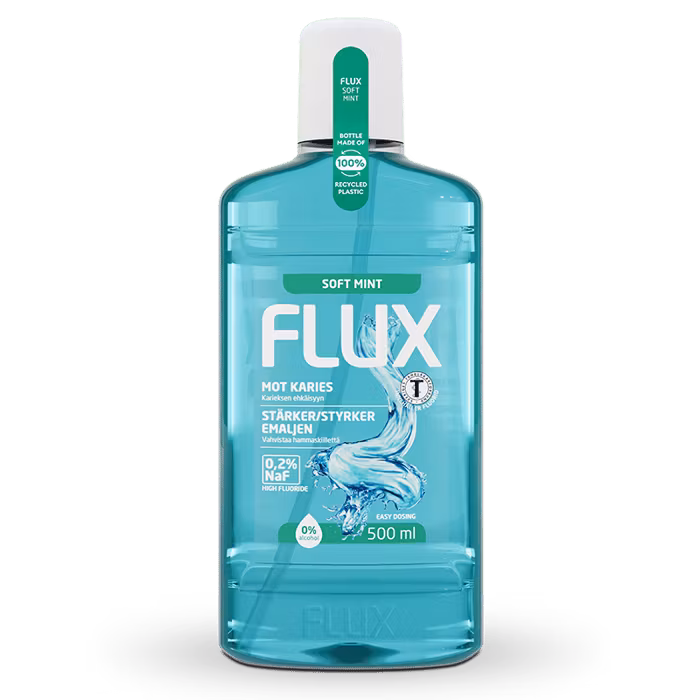 D'un joli turquoise, ce produit est sans alcool. Le flacon de 500 ml est équipé d'une pompe doseuse pratique pour un dosage optimal à chaque utilisation. Ce produit porte le symbole de recommandation de l'Association dentaire suédoise. Flux a été développé en Suède en étroite collaboration avec des professionnels de la santé dentaire.