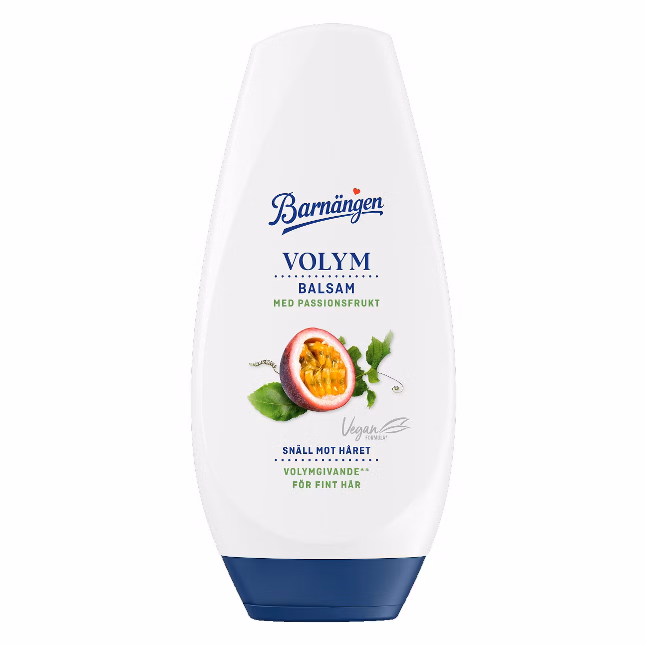 Formula leggera e vegana* con estratto di frutto della passione. Nutre e ammorbidisce senza appesantire e lascia una sensazione di freschezza, per un volume naturale. Utilizzare insieme allo shampoo Barnängen Volym.