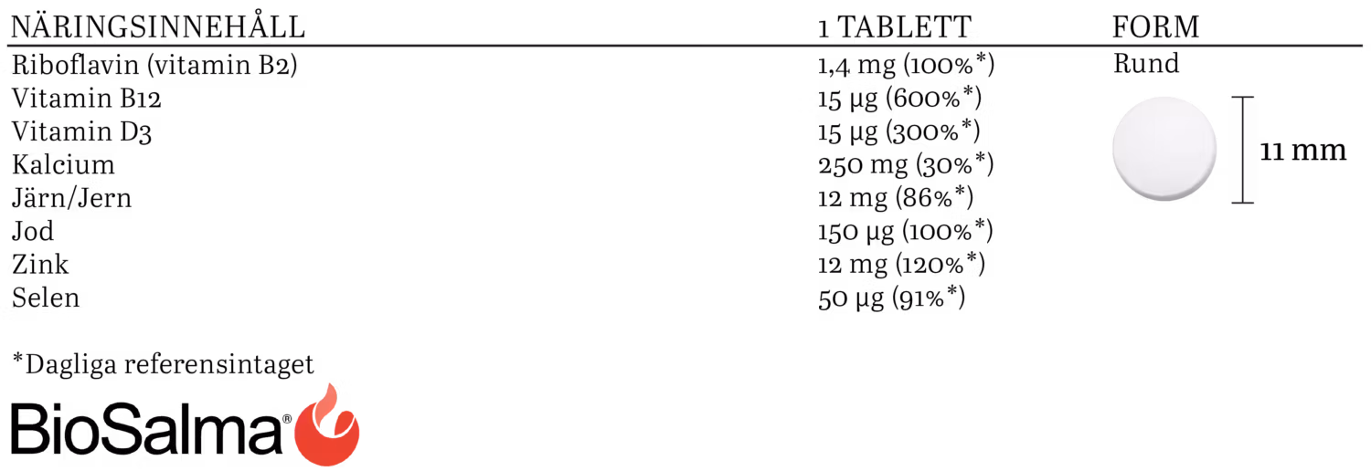 BioSalma Multivitamin Vegan D3++ è un integratore vitaminico e minerale appositamente adattato per te che sei vegano o vegetariano. Poiché si è scoperto che noi al nord abbiamo un fabbisogno extra di vitamina D dalla dieta, abbiamo scelto di aumentare la quantità di questa vitamina nei nostri multivitaminici. Naturalmente, la vitamina D è solo di origine vegana. BioSalma Vegan contiene vitamine B2 e B12 e minerali come ferro, zinco, iodio, selenio e calcio. Queste sostanze potrebbero essere un po' più difficili da ottenere in quantità sufficiente per coloro che escludono i prodotti di origine animale.