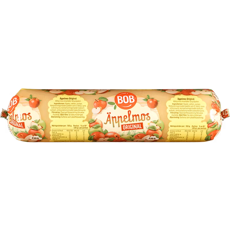 BOB Applesauce in confezione di ricarica climate-smart. BOB Applesauce è di alta qualità e viene realizzata il più possibile con mele svedesi. BOB Applesauce viene cotta e confezionata nel nostro stabilimento di marmellate e purè a Tollarp in Scania.