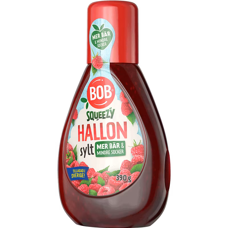BOB Squeezy Raspberries – Ora con ancora più deliziose bacche maturate al sole e anche con il 30% di zucchero in meno. La marmellata viene cotta nel nostro stabilimento di Tollarp in Scania. Le bacche intere vengono schiacciate in loco nello stabilimento e poi bollite fino a ottenere una consistenza liscia che si adatta perfettamente alla bottiglia squeeze. Una confezione pratica e un gusto che si adatta a tutta la famiglia.