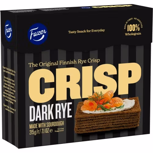 I biscotti di pasta madre scura hanno un gusto scuro raffinato con una dolcezza leggera e contengono ben il 20% di fibre. Prova ad abbinarli a guarnizioni come salmone affumicato a freddo e formaggio. Cotti al forno a Lahti..