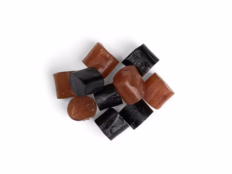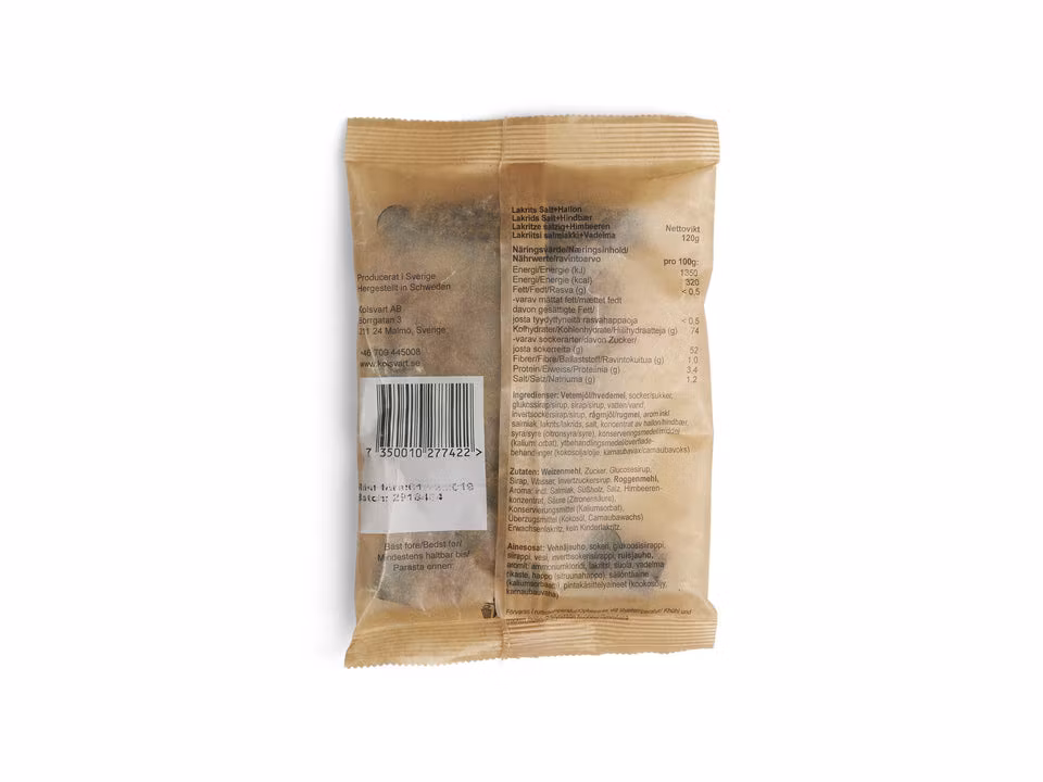 Farina di frumento, zucchero, sciroppo di glucosio, sciroppo, acqua, sciroppo di zucchero invertito, farina di segale, aroma incl. salmiak, liquirizia, sale, concentrato di lampone, acido (acido citrico), conservante (sorbato di potassio), agente di trattamento superficiale (olio di cocco, cera di carnauba).