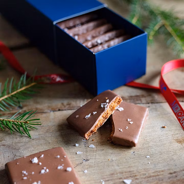 Biscotti francesi croccanti allo zenzero che abbiamo immerso nel cioccolato al latte e guarnito con sale in scaglie. Una volta che inizi a mangiarne uno, è molto difficile fermarsi, magicamente deliziosi! Consegnati in una raffinata scatola regalo come in foto.