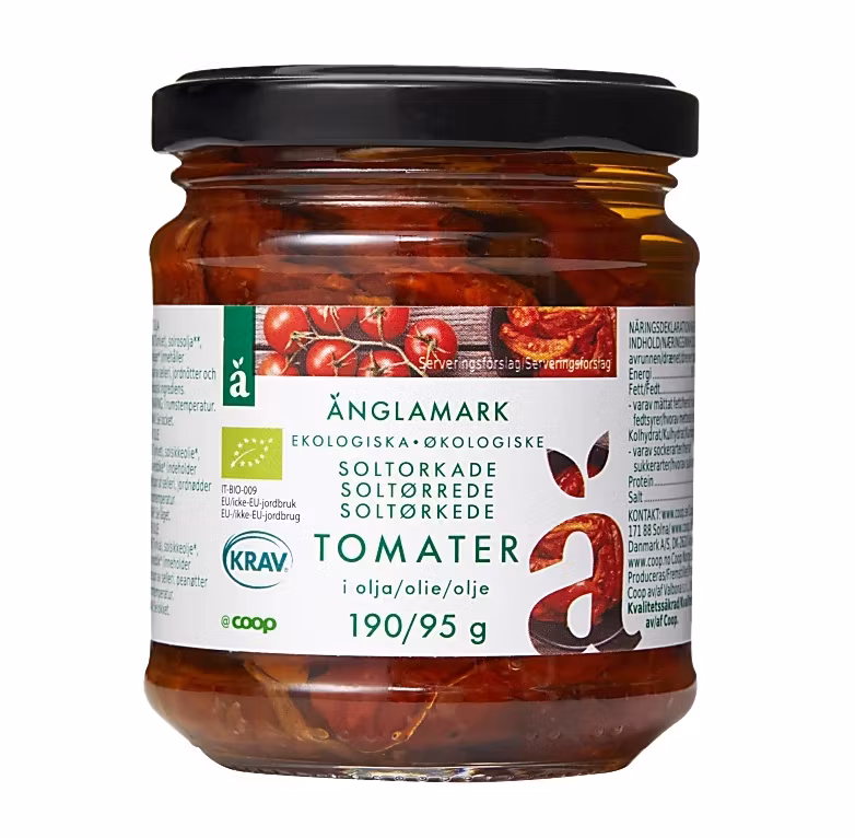 INGREDIENTS: Sun-dried tomatoes** 50% (Turkey), sunflower oil**, salt, acidity regulator (E 270), vinegar* (contains SULPHITES), garlic powder*. May contain traces of celery, peanuts and mustard. *Organic ingredient. **KRAV- organic ingredient. The KRAV label is verified by KIWA.