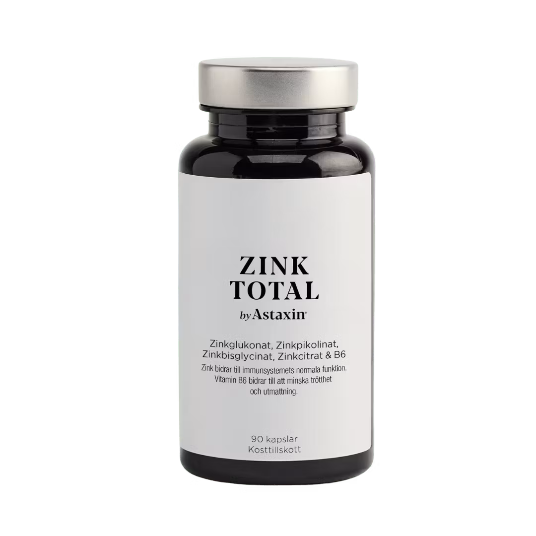 Astaxin Zinc Total by Astaxin 90 capsules is a dietary supplement with four easily absorbable forms of zinc: zinc gluconate, zinc picolinate, zinc bisglycinate and zinc citrate. The combination provides a broad and high bioavailability while being gentle on the stomach. Zinc contributes to the normal function of the immune system and is suitable for those who want to ensure a stable daily zinc intake. The capsules are vegetable and developed and manufactured in Sweden.