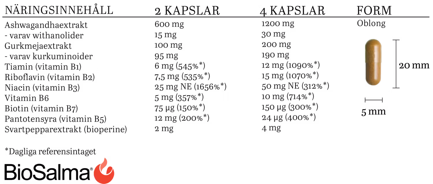 Contents per 2 capsules 4 capsules: Ashwagandha extract 600mg** 1200 mg** of which withanolides 15mg** 30 mg** Turmeric extract 100mg** 200 mg** of which curcuminoids 95mg** 190 mg** Thiamine (vitamin B1) 6 mg (545 %*) 12 mg (1090%*) Riboflavin (vitamin B2) 7.5 mg (535%*) 15 mg (1070%*) Niacin (vitamin B3) 25 mg NE (156%*) 50 mg NE (312% *) Vitamin B6 5 mg (357%*) 10 mg (714%*) Biotin (vitamin B7) 75 µg (150%*) 150 µg (300%*) Pantothenic acid (vitamin B5) 12 mg (200%*) 24 mg (400%*) Black pepper extract (Bioperine) 2 mg** 4 mg**. * % of DRI (Daily Reference Intake). ** DRI missing.