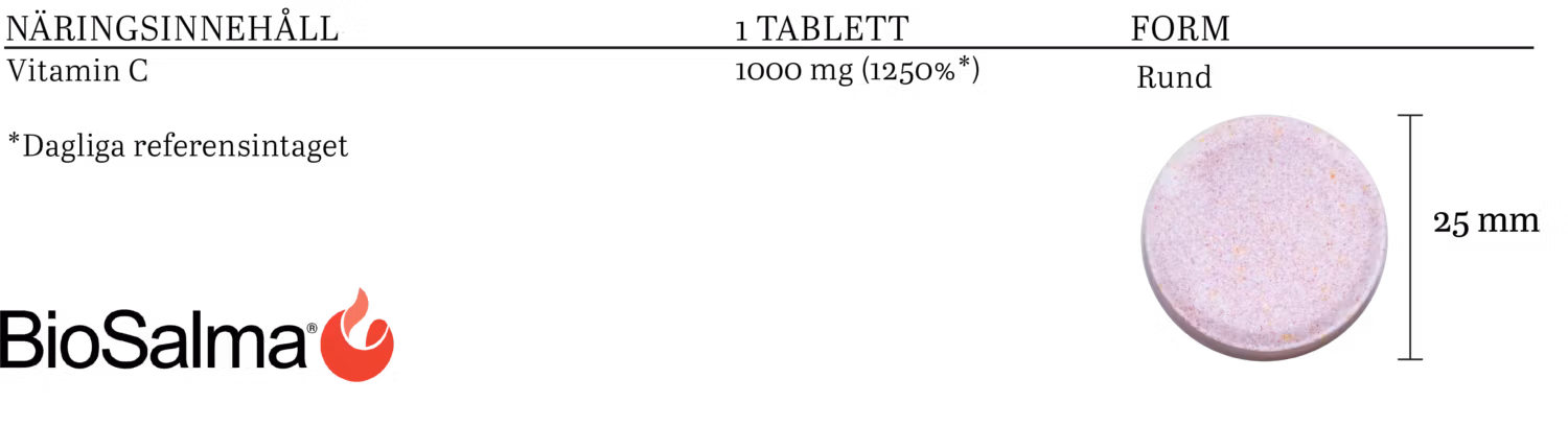 BioSalma vitamin C with strawberry flavor has a good taste of strawberry. The effervescent tablets are sugar-free and contain a full 1000 mg of water-soluble vitamin C. The fact that it is water soluble means that it is easily absorbed in the body. Vitamin C is not stored for any length of time in the body, but we need a continuous intake. Vitamin C acts as an antioxidant and protects cells from oxidative stress. Vitamin C contributes to the normal function of the immune system, a normal mental function and a normally functioning nervous system. Vitamin C helps reduce fatigue and exhaustion, and increases the body's absorption of iron. In addition, vitamin C contributes to the normal formation of collagen, which contributes to the normal functioning of skin, cartilage, bones and blood vessels.