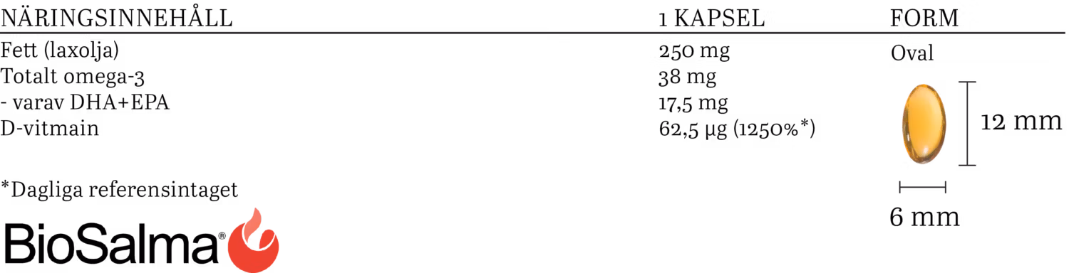 In our high concentrate 62.5 μg, we have made our capsules small to be easily swallowed. The vitamin D is highly concentrated and dissolved in natural salmon oil, containing, among other things, phospholipids, to improve the absorption of the fat-soluble vitamin D. Vitamin D contributes to maintaining the normal function of the immune system. Vitamin D contributes to maintaining normal bone structure.