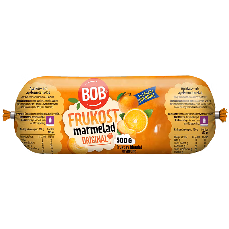 BOB Breakfast marmelade Refill 500 g - in a climate-smart refill. BOB marmalade is of high quality, made from selected fruit. Our marmalade is cooked and packed in our factory in Tollarp in Scania, and it has been doing so since the 1940s. A classic on the breakfast table!