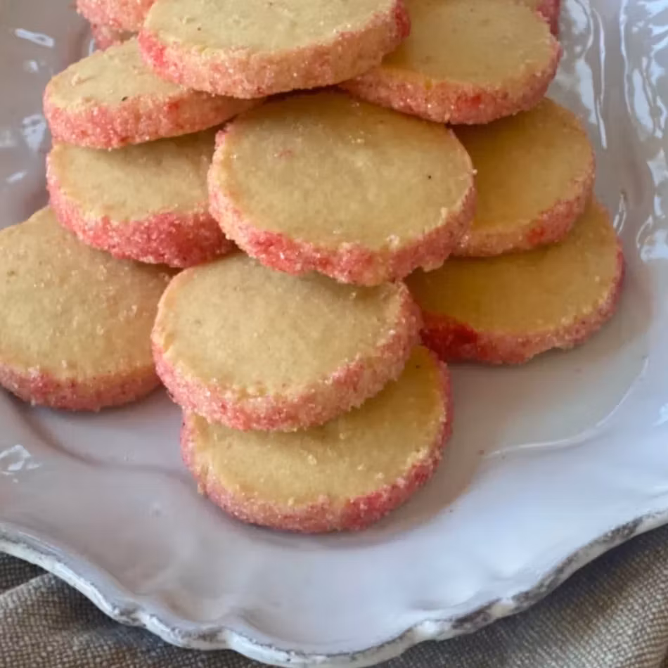 Small round cookies baked on shortcrust pastry made from Swedish butter. With their pink edge, these cookies look extra cute on the cake plate.