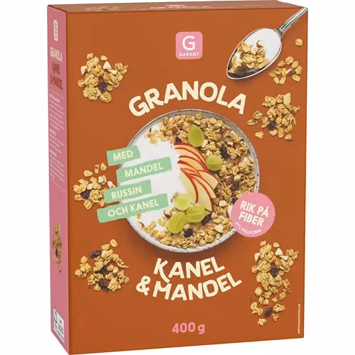 OAT* 49%, oligofructose, WHEAT FLAKES*, sunflower oil, raisins 5% (raisins, sunflower oil), roasted ALMOND 3%, chia seeds (Salvia hispanica), sunflower seeds, linseed, salt, cinnamon 0.4%. *Whole grain. The product contains 61% whole grains. May contain traces of PECAN NUTS, BRAZIL NUTS, CASHEW NUTS, PISTACHIO NUTS, WALNUT, HAZELNUT and MACADAMIA NUTS.