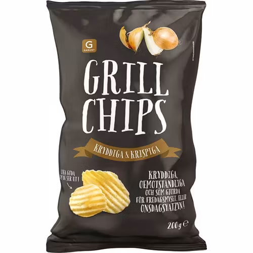 Garant Grill Chips - 200 grams 12,99 € In Stock. Add to cart Share Information Barbecue chips. Spicy and crispy. Irresistible and as if made for the Friday cozy or the Wednesday night out. 200 grams.Potatoes, sunflower oil, spice mix (onion powder 2.1%, salt, dextrose, maltodextrin, natural flavoring (cayenne)).
