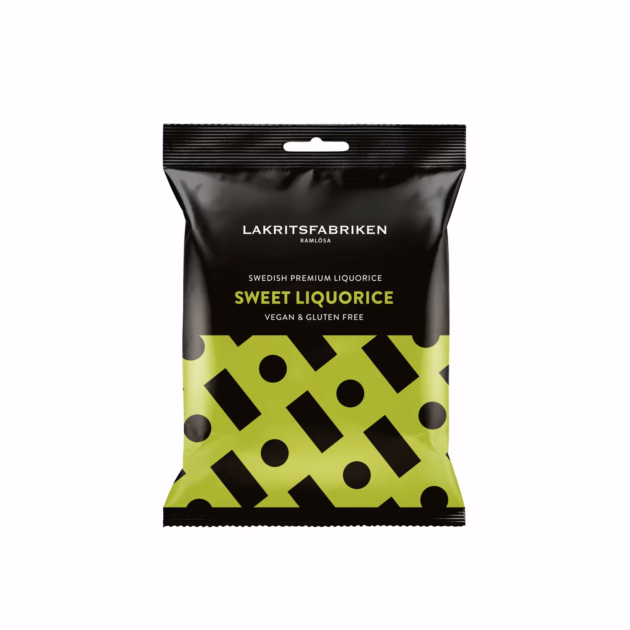 A bag filled with juicy, gluten-free and vegan sweet soft licorice in Licorice Factory's signature green colour.