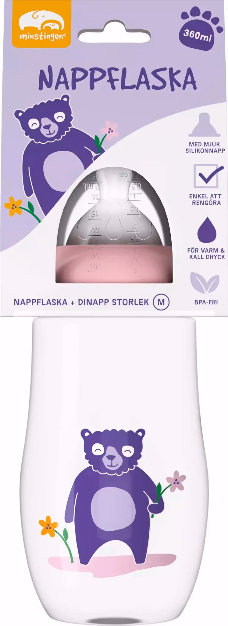 Baby bottle 360ml with accompanying teat made of soft silicone. The bottle is suitable for both hot and cold drinks and is easy to clean. When the liquid is to be heated in the bottle, it must be done without the screw cap and teat. The bottle can be used in the microwave. Material: BPA-free baby bottle and teat. Baby bottle made of polypropylene (PP) and teat made of soft silicone.