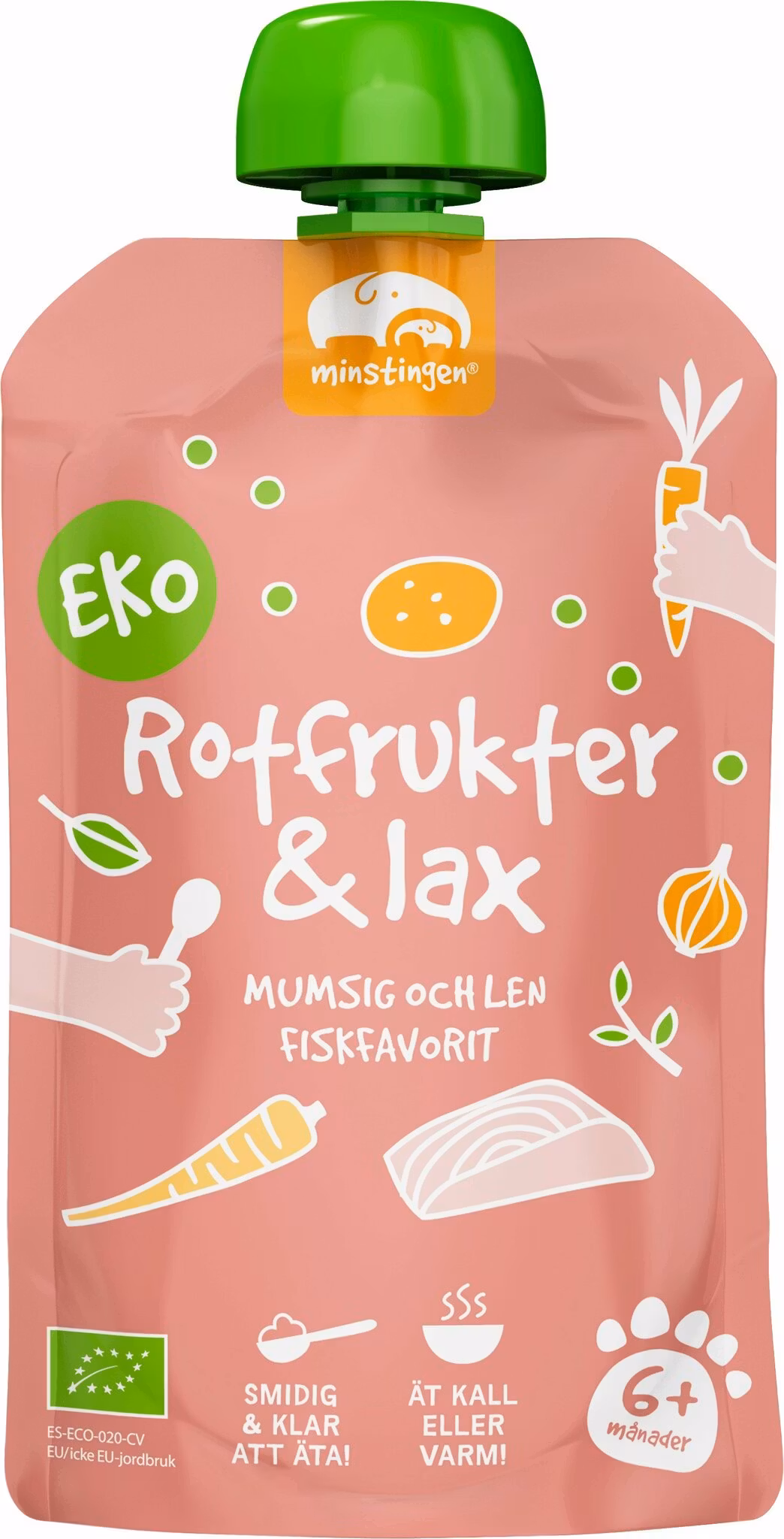 Organic puree of root vegetables and salmon. Our baby food in a squeeze bag is suitable for children over 6 months. Serve at room temperature or heat in a water bath or in a bowl in the microwave. Perfect when your little one needs energy. Store at room temperature. Opened packaging is stored in the refrigerator +8°C, lasts for a maximum of one day.