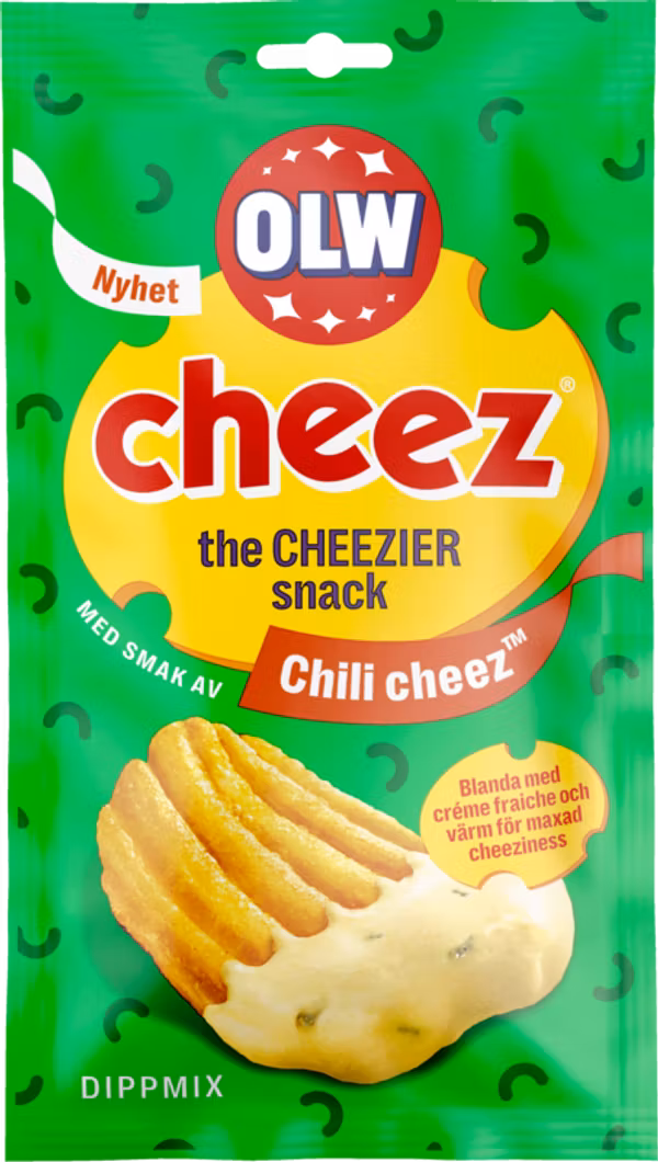 Delicious and creamy dip with the taste of cheddar cheese and chili. OLW's Dippmix chili cheez is a new variation on dip that can also be heated when mixed with crème fraiche or another heatable base.