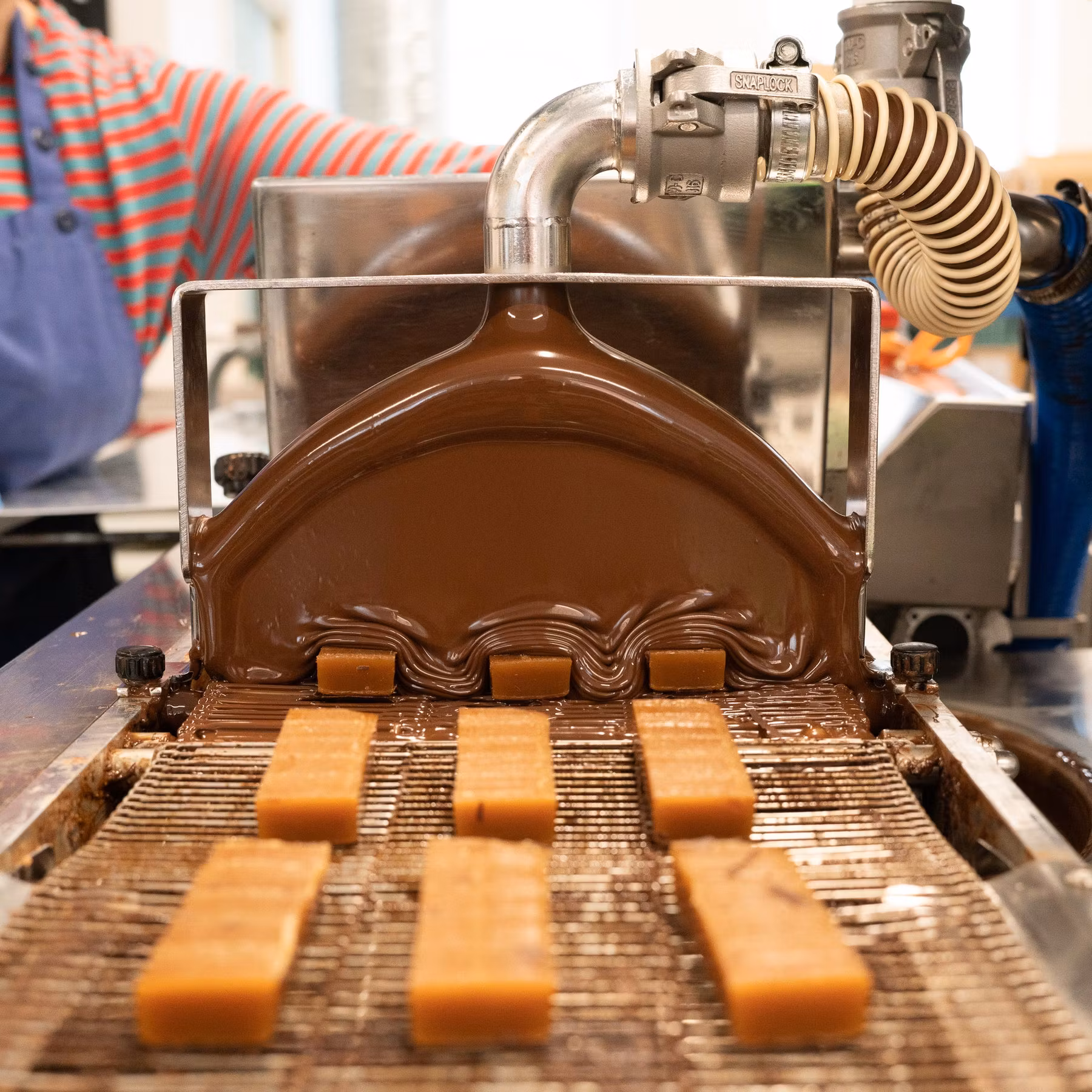 Slightly larger bars of buttery caramel – the crème de la crème of our craft. Twist wrapped by hand, made with the greatest care. Some filled with delicate chunks of nuts or pieces of berries, and some just plain caramel. Dipped in dark chocolate or just as they are. Share one with a friend or enjoy a delicious bite yourself.