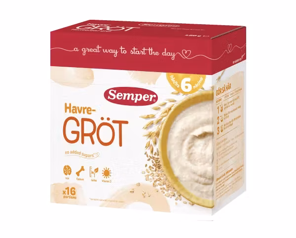 Porridge is a perfect start to the day, even for the little ones. All children need energy to be able to discover the world and with Semper's porridge they get the strength to take part in everything exciting that is happening around them. Semper porridge is suitable at any time of the day because it is nutritionally complete! Semper Oatmeal porridge pear, banana & apple is made with oats and wheat and is suitable for children from 8 months. Whole grain oats have a good taste that children usually like and oats also contain a mixture of soluble and insoluble fibers. We have also reviewed and adjusted the fruit and berry content in our recipes so that children will get used to a less fruity taste of the porridge. Semper porridge is always enriched. With iron that contributes to the normal development of the brain, iodine that contributes to the normal growth of the brain, calcium that is needed for the skeleton to grow properly, and vitamin D that contributes to the normal immune function in children. Remember that a varied and balanced diet is an important basis for healthy habits. We also add fat to our porridge. Men only choose the right kind of fat. Semper porridge contains fat from cream, rapeseed and sunflower oil. This gives it a good fat composition with a low content of saturated fat and a high proportion of unsaturated fat. We are proud of that.