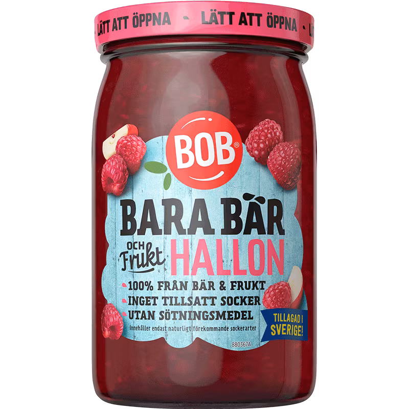 BOB Tylko jagody i owoce Maliny – 100% z jagód i owoców. Bez dodatku cukru i słodzików. Wszystkie nasze produkty BOB są wytwarzane w Szwecji z najlepszych surowców. Smak dojrzewających w słońcu jagód i owoców nigdy nie był lepszy! Idealne do naleśników, gofrów lub owsianki i jogurtu. A może zwieńczyć je twarogiem?