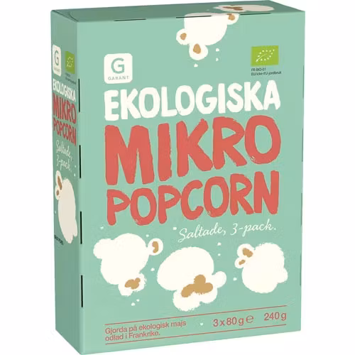 Garant Organic Popcorn - 240 gramów 9,99 € W magazynie. Dodaj do koszyka Udział Informacja Organic Salted Micro Popcorn. 3-pack.Ziarna kukurydzy* 86%, olej palmowy*, sól. *Surowiec organiczny.