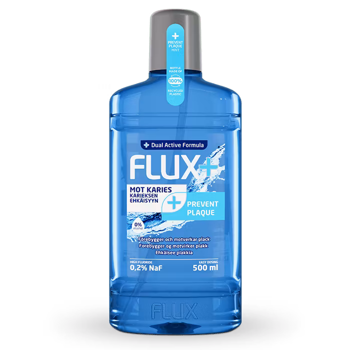 Flux Prevent Plaque to płyn do płukania jamy ustnej, który ma dwa efekty: