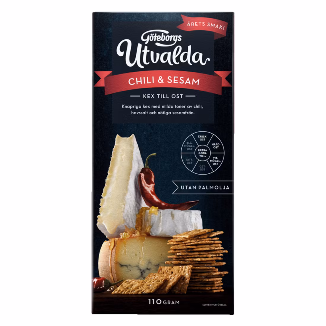 Selected Chili & Sesame goes very well together with a creamy cream cheese, a kind white mold cheese or aged hard cheese.