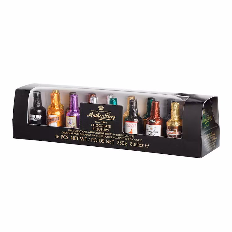 The box contains 16 bottle-shaped chocolate pralines of exquisite Anthon Berg chocolate, filled with classic flavors such as Cointreau, Famous Grouse, Likör 43, Galliano and Drambuie. According to Anthon Berg himself, the best way to enjoy the chocolate is to choose a favorite, open the colorful foil that surrounds the chocolate, and then turn the piece of chocolate upside down. Bite off the bottom, drink the contents and then munch on the rest of the chocolate. Yum and toast!